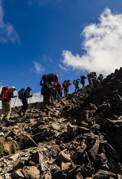 Vi kommer inte att gå långt idag i termer av sträcka, för vandringsleden blir brantare. Däremot tar vi många höjdmeter och börjar verkligen känna oss taggade inför kommande natts tur till toppen. Vi lämnar vegetationen bakom oss, och när vi kommer fram till vårt nästa läger är vi på så hög höjd att träd och buskar inte växer alls. Ju längre upp på berget vi kommer, desto torrare blir miljön.